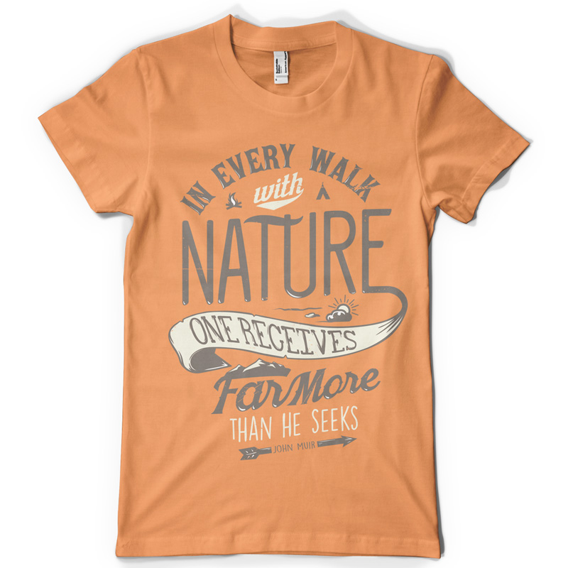 "Walk of Nature" T-shirt design featuring typography style text of a John Muir quote, with distressed details. The files available are suitable for Adobe Illustrator, Adobe Photoshop and Corel Draw and can be used for digital printing and screenprinting.