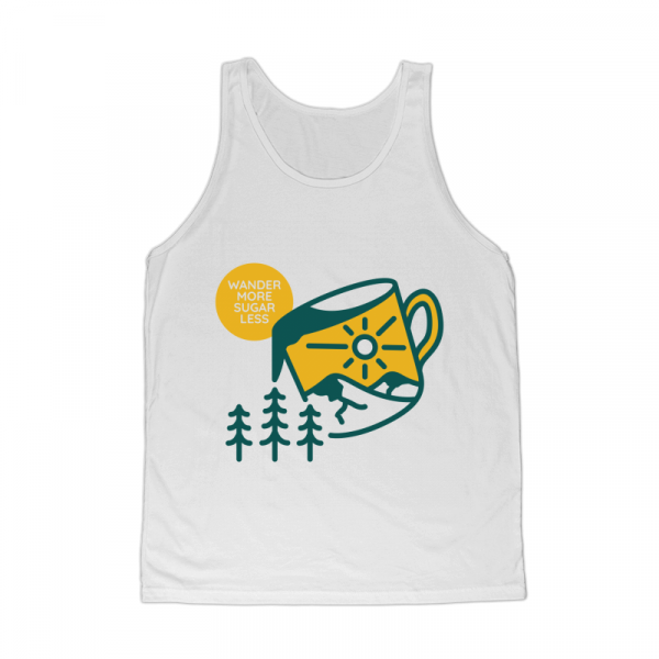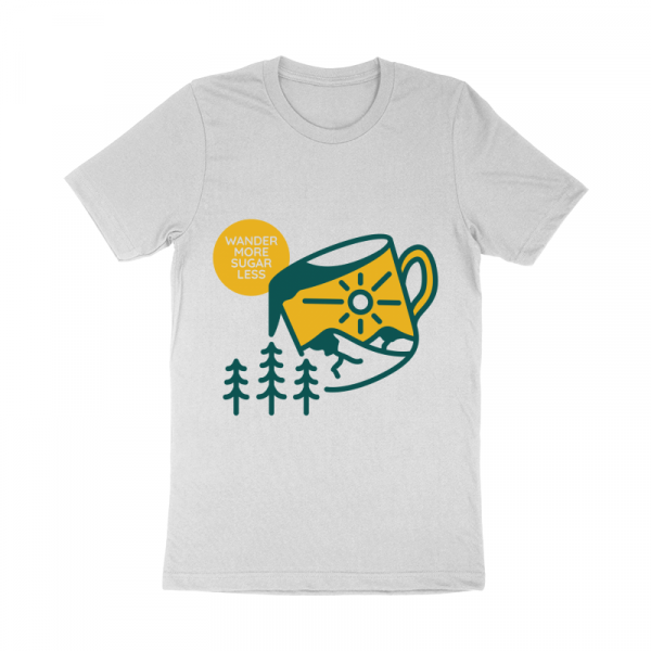Wander More Sugar Less 1 is a monoline illustration for apparel or merchandise about nature, outdoors, mountain, adventure, national park, holiday, wildlife, travel, wanderlust, drink, coffee, caffeine, barista, coffee addict, espresso.