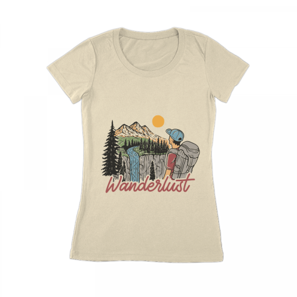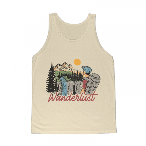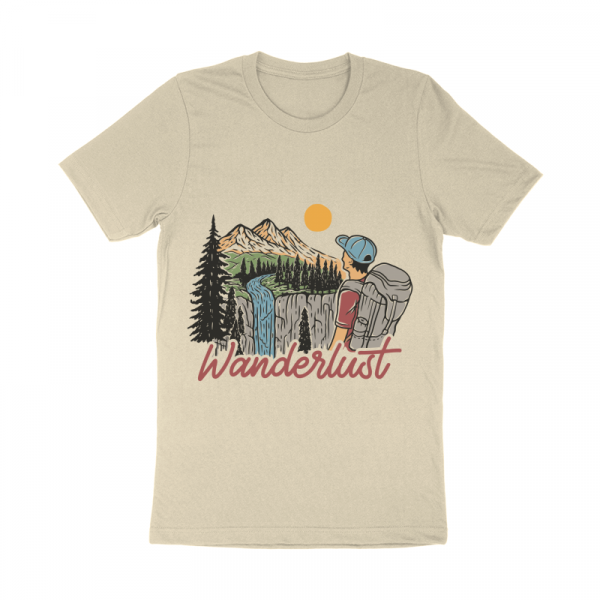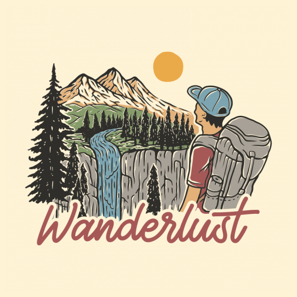 Wanderlust is a vintage illustration that is suitable for t-shirts, jackets, or merchandise with the theme of camping, tent, campfire, mountains, national park, adventure, summer, holiday, travel, nature, outdoors, hiking, backpacker, wanderlust, waterfall.