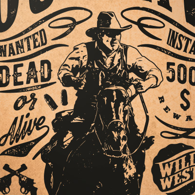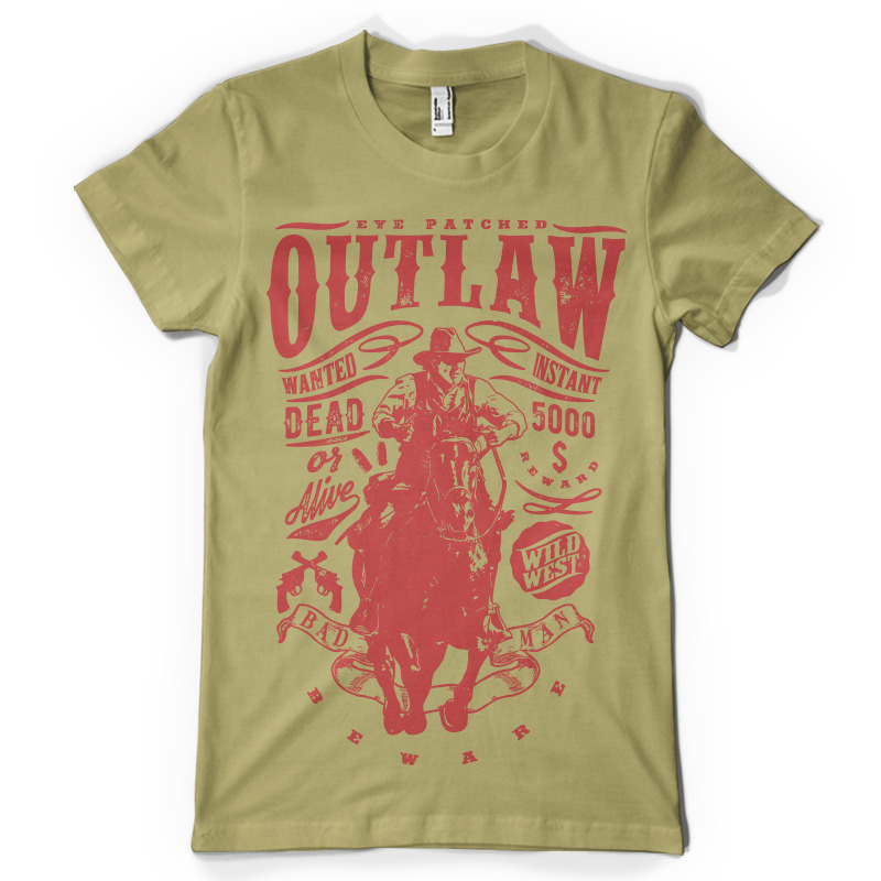 "WANTED" T-shirt design featuring wild west renegade. The files available are suitable for Adobe Illustrator, Adobe Photoshop and Corel Draw and can be used for digital printing and screenprinting.