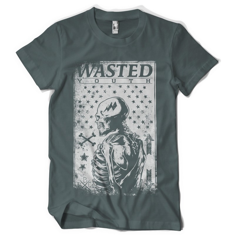 Wasted Youth graphic design template in vector format, featuring detailed sad skeleton now available for Adobe Illustrator, Adobe Photoshop and Corel Draw and can be used for digital printing and screenprinting .