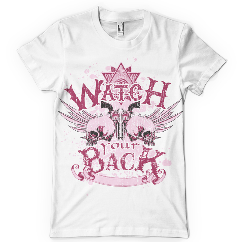 Watch your back printed t-shirt features a detailed screen print of pistols and skulls is now available in EPS format file and can be used for digital printing and screenprinting . Ready to print or use in anything you want.