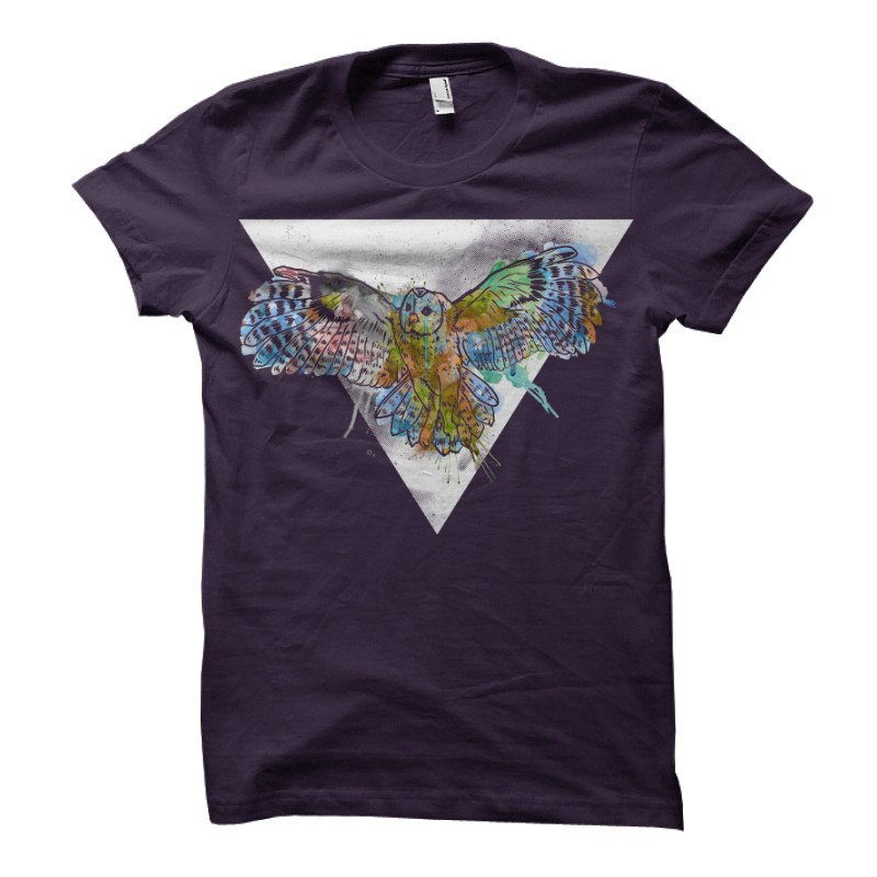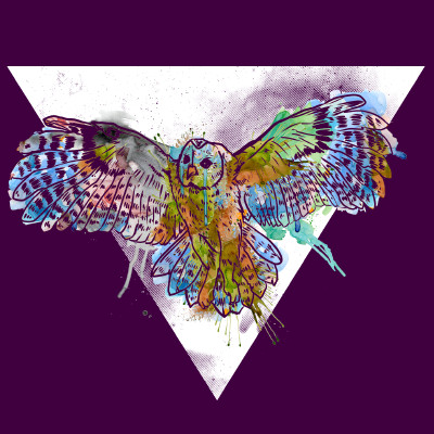This design features an owl in flight, spreading watercolors from its feathers.