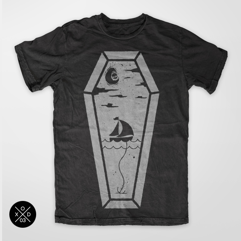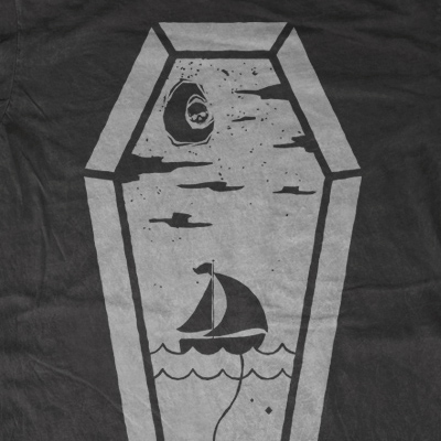 Watery grave T-shirt design template in vector format, featuring detailed landscape on a coffin now available for Adobe Illustrator and can be used for digital printing and screenprinting .