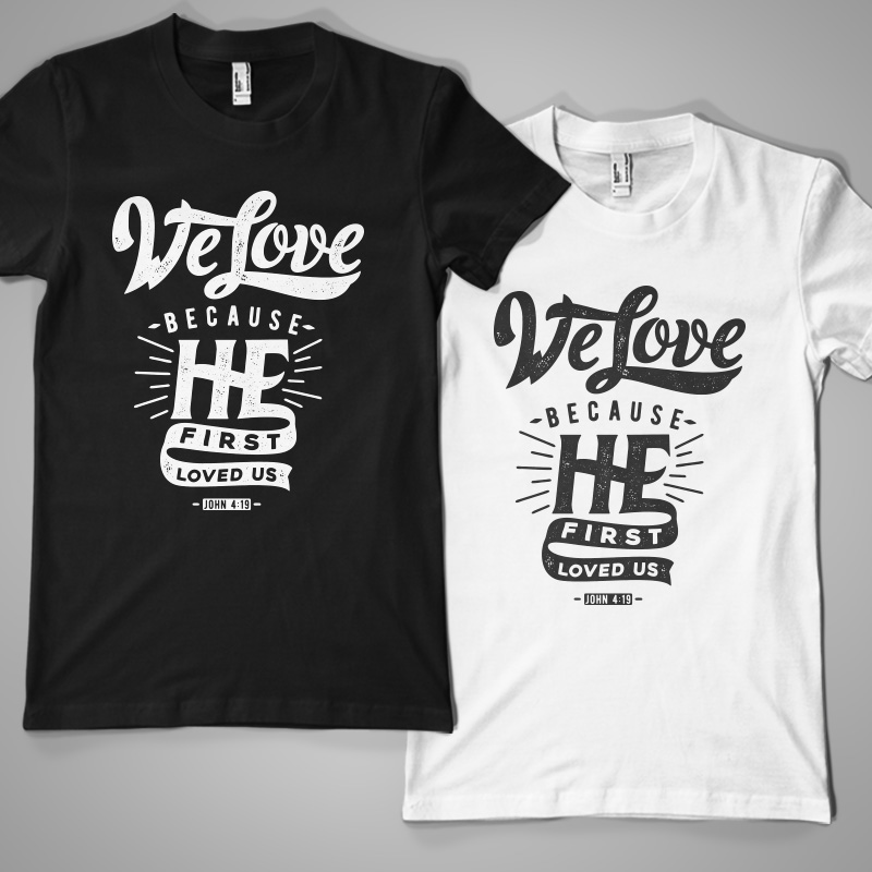 "We Love" T-shirt design featuring typography style religious quote, with distressed details. The files available are suitable for Adobe Illustrator and Adobe Photoshop and can be used for digital printing and screenprinting.