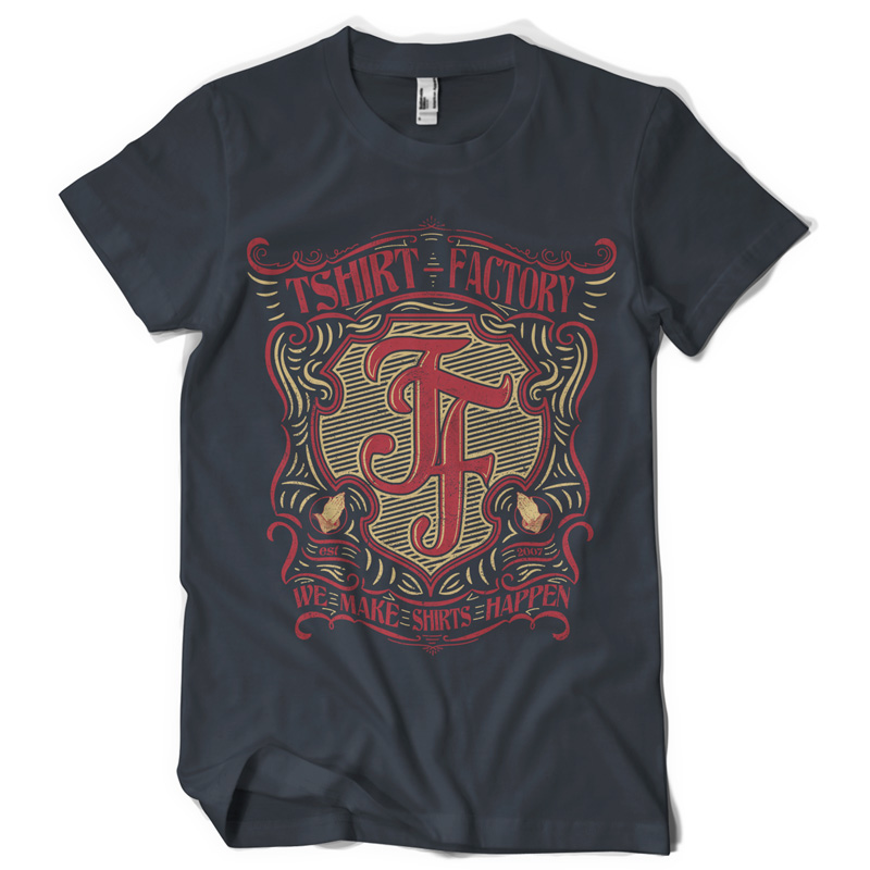 We make shirts happen graphic design template in vector format, featuring detailed t-shirt factory shield now available for Adobe Illustrator, Adobe Photoshop and Corel Draw and can be used for digital printing and screenprinting .