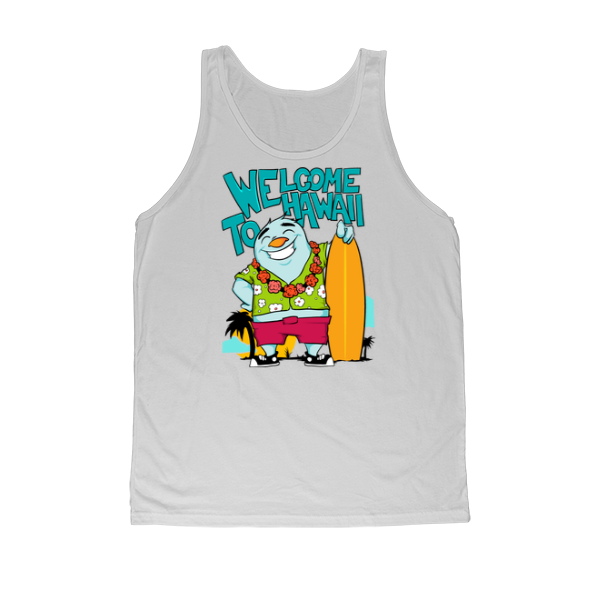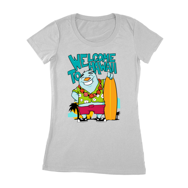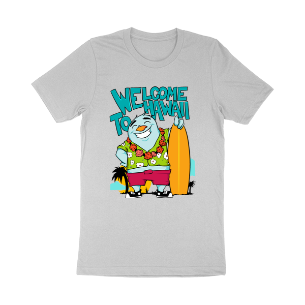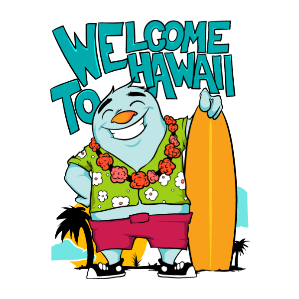 T-shirt design featuring a cartoon character from a sunny beach in hawaii with a surf board. Welcome to Hawaii t-shirt template is available in vector format and can be used for digital printing and screen printing. The file will be available for Adobe Illustrator and Adobe Photoshop.