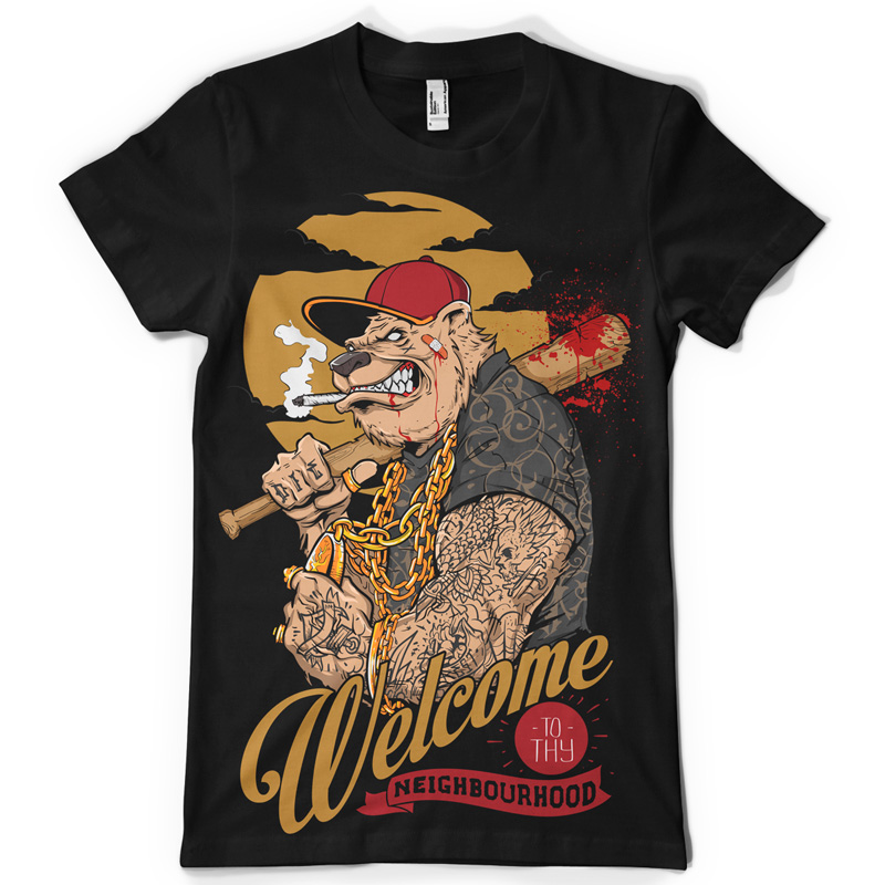 Welcome to thy neighbourhood printed t-shirt features a detailed screen print of badass tattooed dog now available for Adobe Illustrator, Adobe Photoshop and Corel Draw and can be used for digital printing and screenprinting .