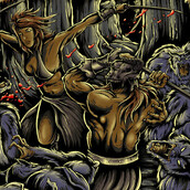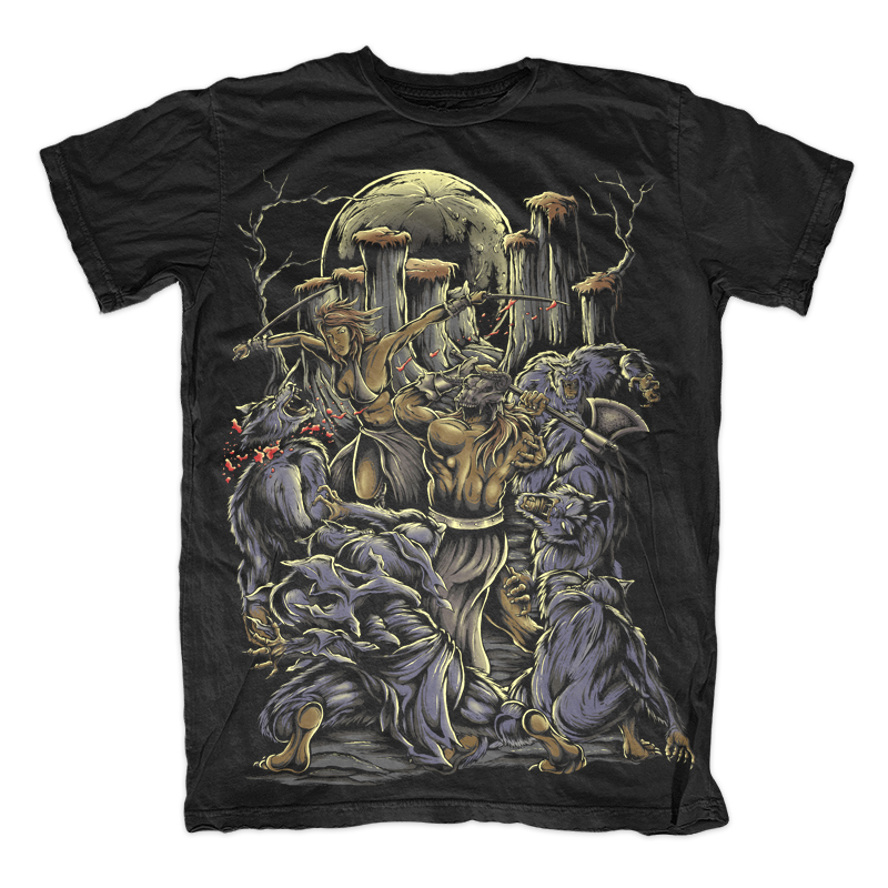 Illustration of a two warriors with axe and sword fights a group of werewolf. This illustration made with vintage comic style. Ready to print on t-shirt.