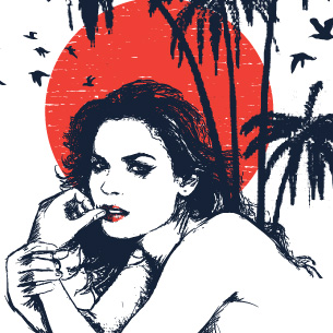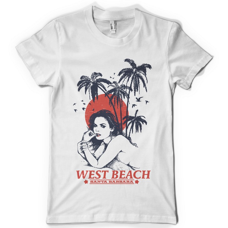 West Beach graphic design template in vector format, featuring detailed hot woman on beach now available for Adobe Illustrator, Adobe Photoshop and Corel Draw and can be used for digital printing and screenprinting .