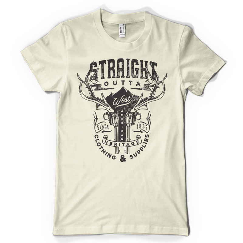 "West" T-shirt design featuring horned guns. The files available are suitable for Adobe Illustrator, Adobe Photoshop and Corel Draw and can be used for digital printing and screenprinting.