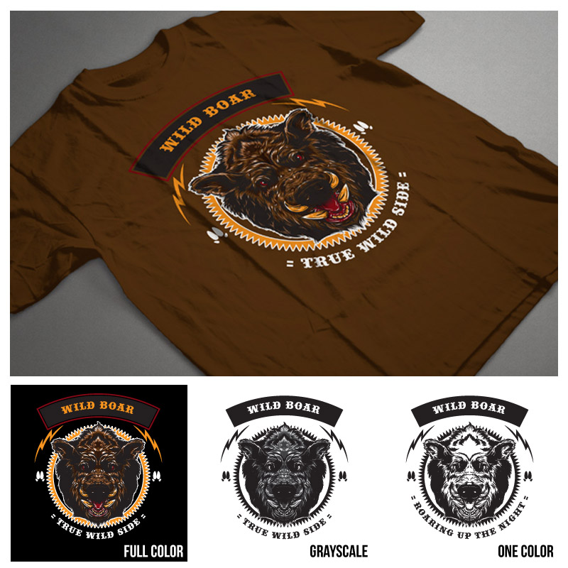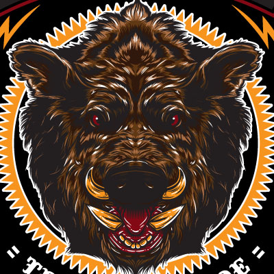 Wild Boar T shirt Illustration "Biker Patches Animals Series" An illustration of an angry Boar head and some ornaments. Suitable for your biker community, clothing line store, or event. Easy to replace the text and colors. ZIP Feautures 3 Folder Full Colors version, Gray Colors Version and 1 Color version Each folder contain 1 EPS 10 1 Ai 1 PSD Size 16'x24' CMYK Color mode Layered Editable text