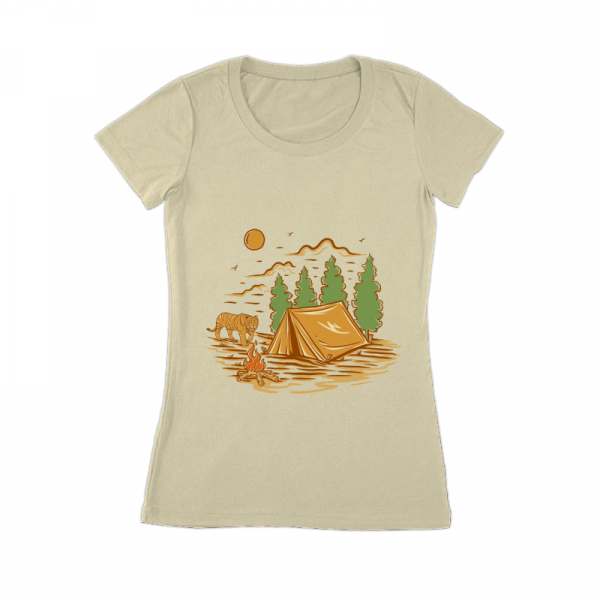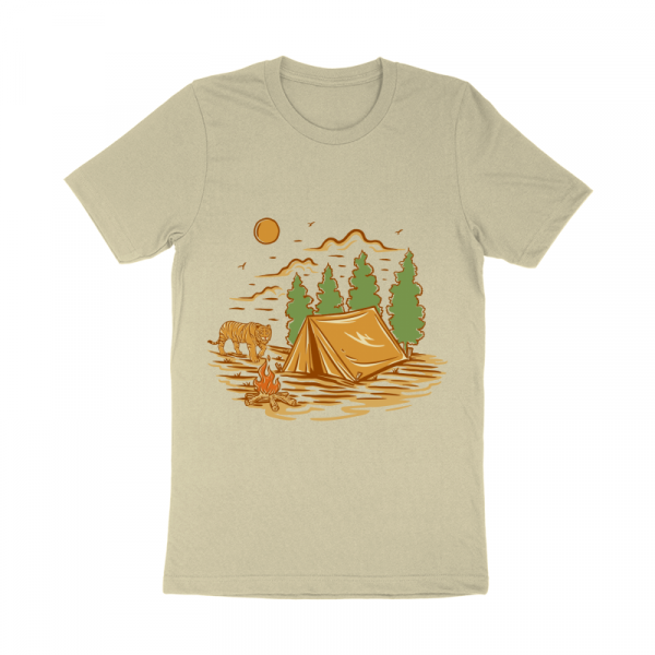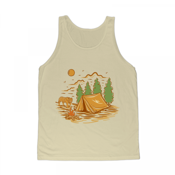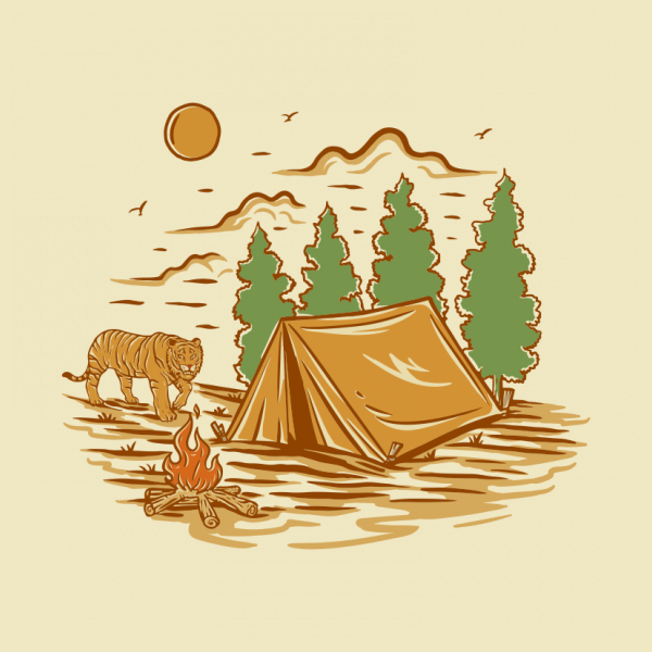 Wild Camping is a vintage illustration that is suitable for t-shirts, jackets, or merchandise with the theme of camping, campfire, nature, outdoors, tent, adventure, wildlife, animal, tiger, lion, wild, lake, national park, travel, wanderlust.
