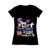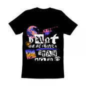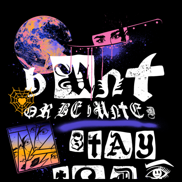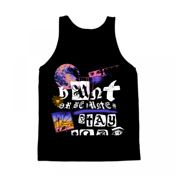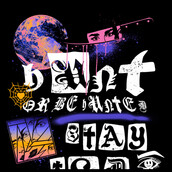 The image features a black background with various shapes and symbols painted in white, including a moon, a spider web, and a basketball. There are also words written in white, such as \"Don't be white,\" \"Stay wild,\" and \"Wish.\" A pink knife is drawn above the words \"Don't be white.\"