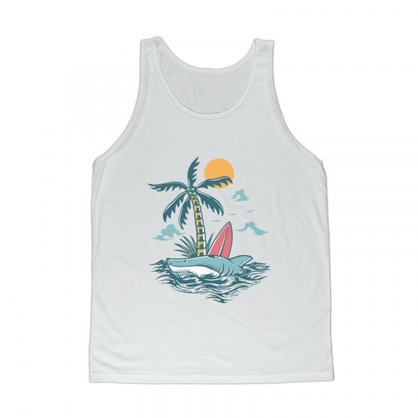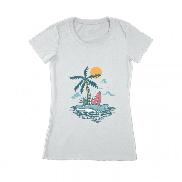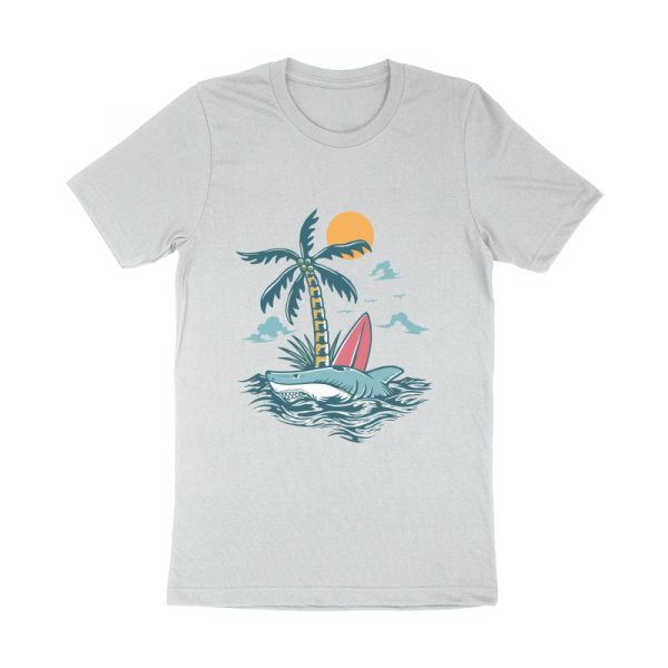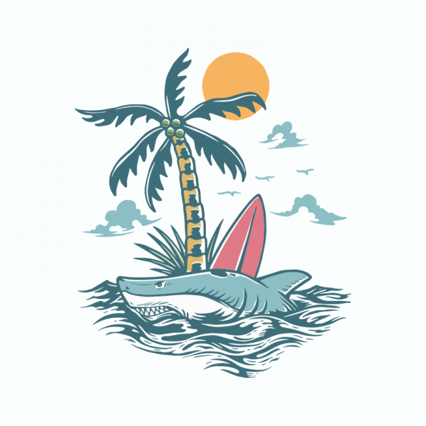 Wild Shark Surfing Island is a vintage illustration that is suitable for apparel or merchandise about nature, outdoors, wild, wildlife, animal, beach, sea, ocean, island, fish, shark, whale, summer, vacation, jaws, holiday.