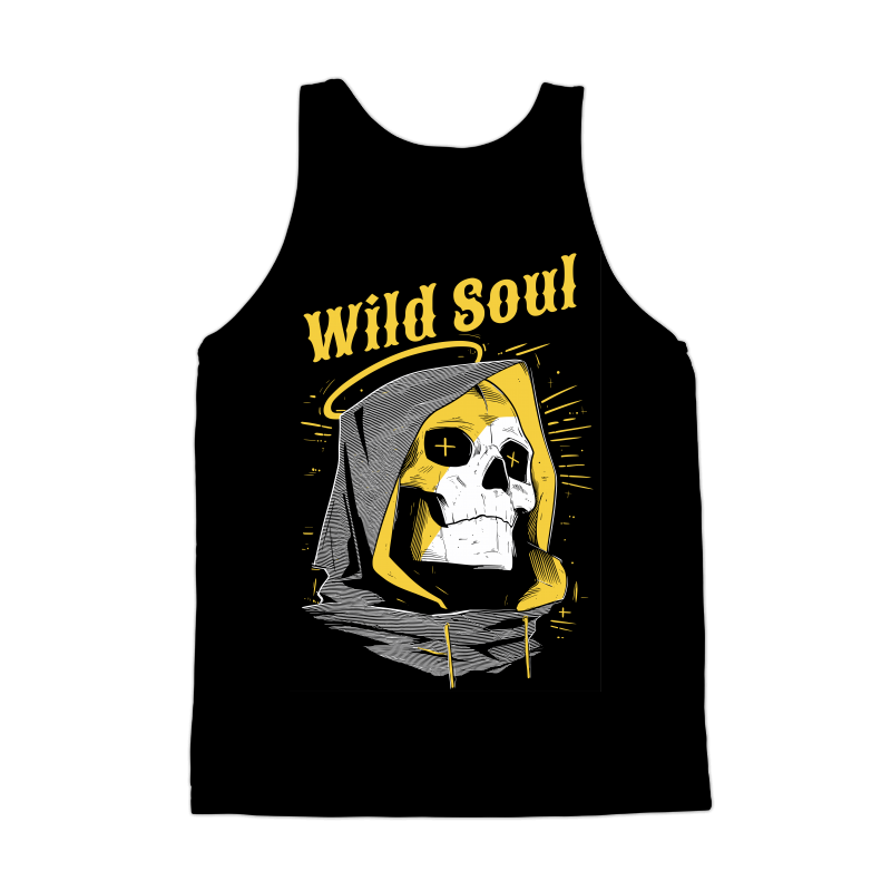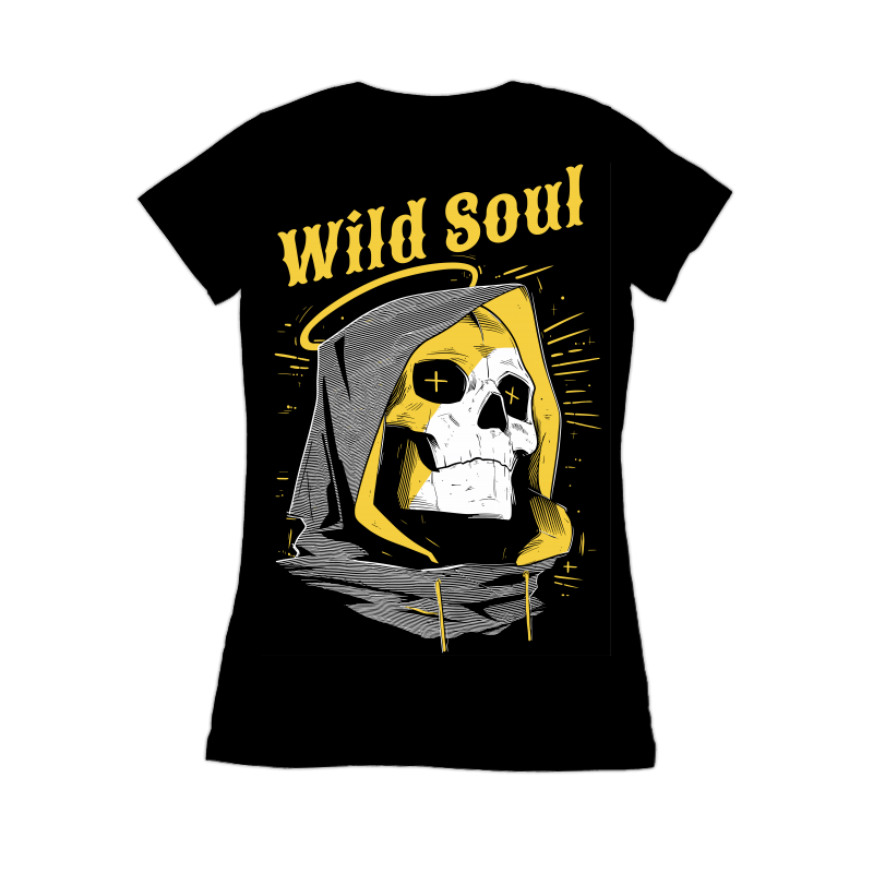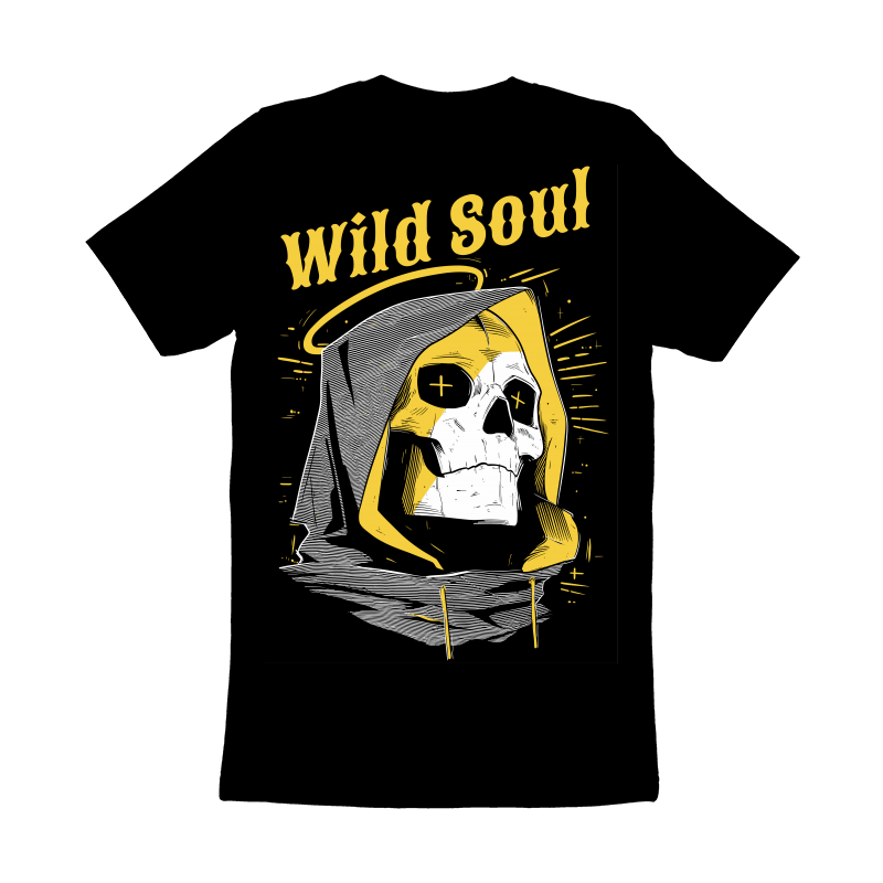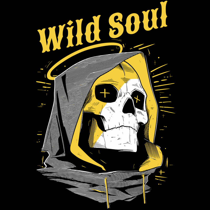This striking design features a stylized skull wearing a hooded garment, reminiscent of a reaper figure. The skull's eyes are marked with crosses, adding a touch of macabre detail. Above the skull, the words "Wild Soul" are written in a bold, vintage-inspired font, complemented by a subtle halo effect. The color palette is limited to black, white, and a muted gold, enhancing the design's stark contrast and visual impact. The overall aesthetic blends elements of vintage tattoo art with modern graphic design, creating a versatile image suitable for various applications. The use of hatching and line work adds depth and texture to the design, giving it a hand-drawn feel.