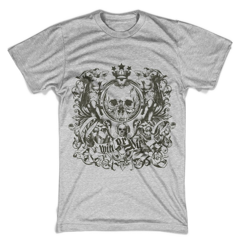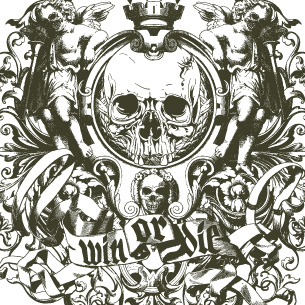 Win or die digital design template in vector format, featuring detailed framed skull and angels now available for Adobe Illustrator, Adobe Photoshop and Corel Draw and can be used for digital printing and screenprinting .