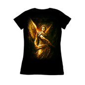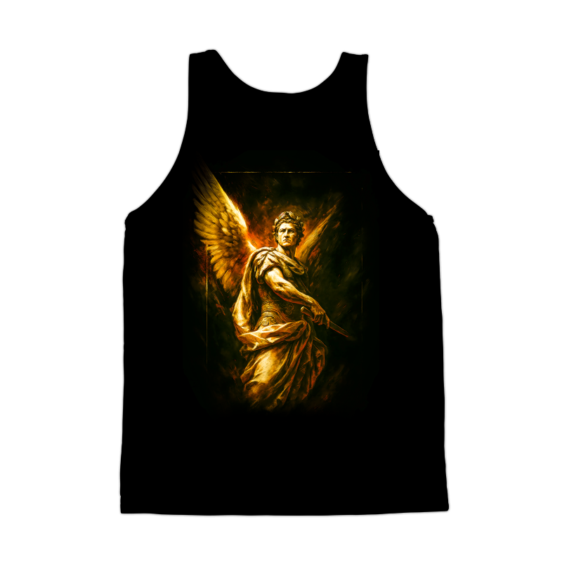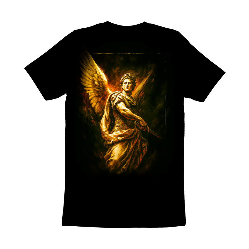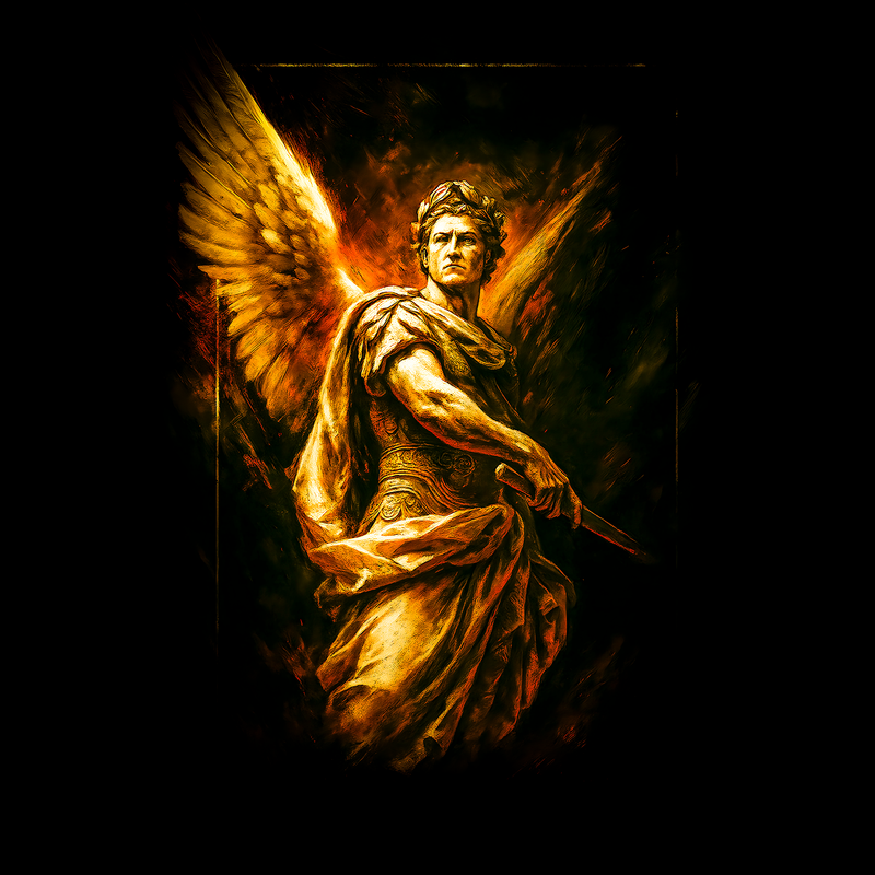This striking design depicts a Roman Caesar, reimagined with majestic wings. The figure is rendered in a painterly style, reminiscent of classical sculptures brought to life with dynamic brushstrokes and a warm, golden palette. He wears a laurel wreath and ornate armor, holding a sword, symbolizing both power and protection. The wings add a fantastical element, elevating the Caesar to a godlike status. The background features fiery hues, suggesting a divine or otherworldly realm. The overall effect is powerful, regal, and slightly surreal, blending historical and mythical elements. Designers could use this image for book covers, particularly in the historical fiction or fantasy genres. It would also be suitable for posters, apparel, or as part of a larger digital art project. The design's strong visual impact makes it ideal for projects needing a touch of classical grandeur and mythical flair. It is perfect for gaming merchandise as well.