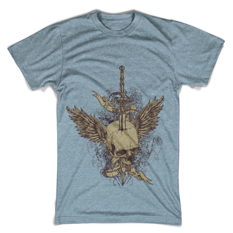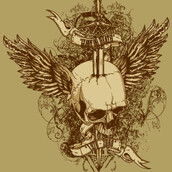 Wings of glory digital design in vector format, featuring detailed stabbed skull with flourish details now available for Adobe Illustrator, Adobe Photoshop and Corel Draw and can be used for digital printing and screenprinting .