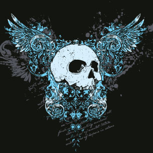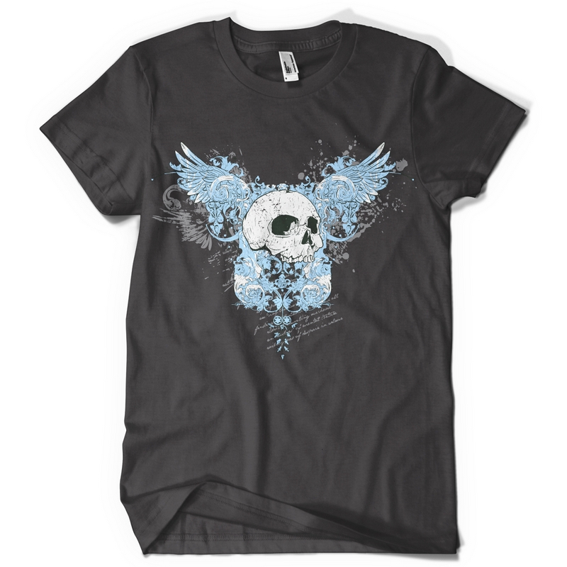 Wings of the skull t-shirt design with flourish details and text design is available in vector format for Adobe Illustrator, Adobe Photoshop and Corel Draw and can be used for digital printing and screenprinting .
