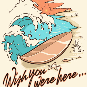 Wish you where here design template in vector format, featuring detailed waves and surfboard now available for Adobe Illustrator, Adobe Photoshop and Corel Draw and can be used for digital printing and screenprinting .