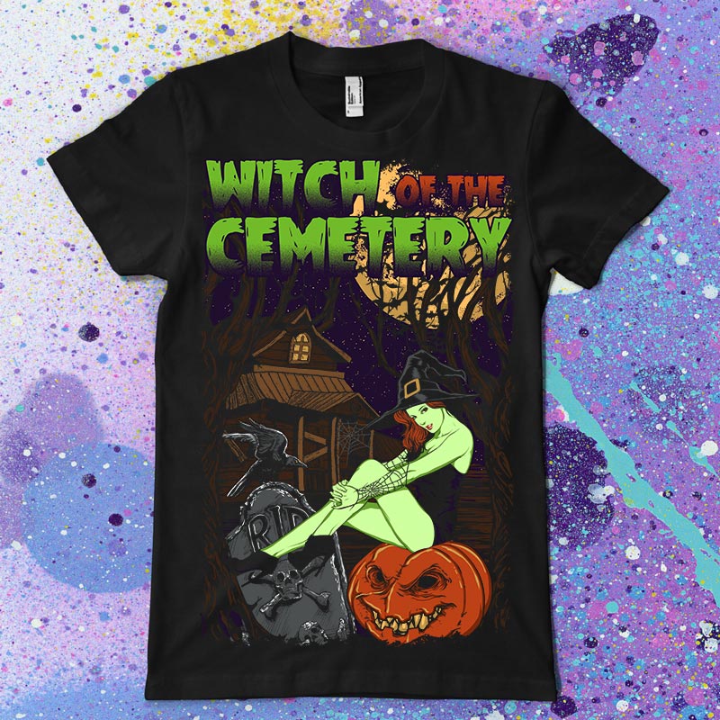Witch of the Cementery t-shirt design features a witch sexy detailed screen print now available for Adobe Illustrator, Adobe Photoshop and Corel Draw and can be used for digital printing and screenprinting