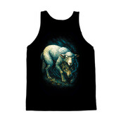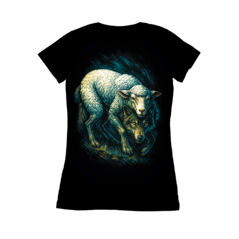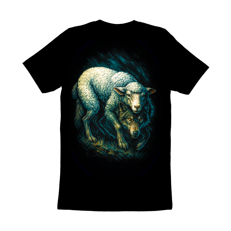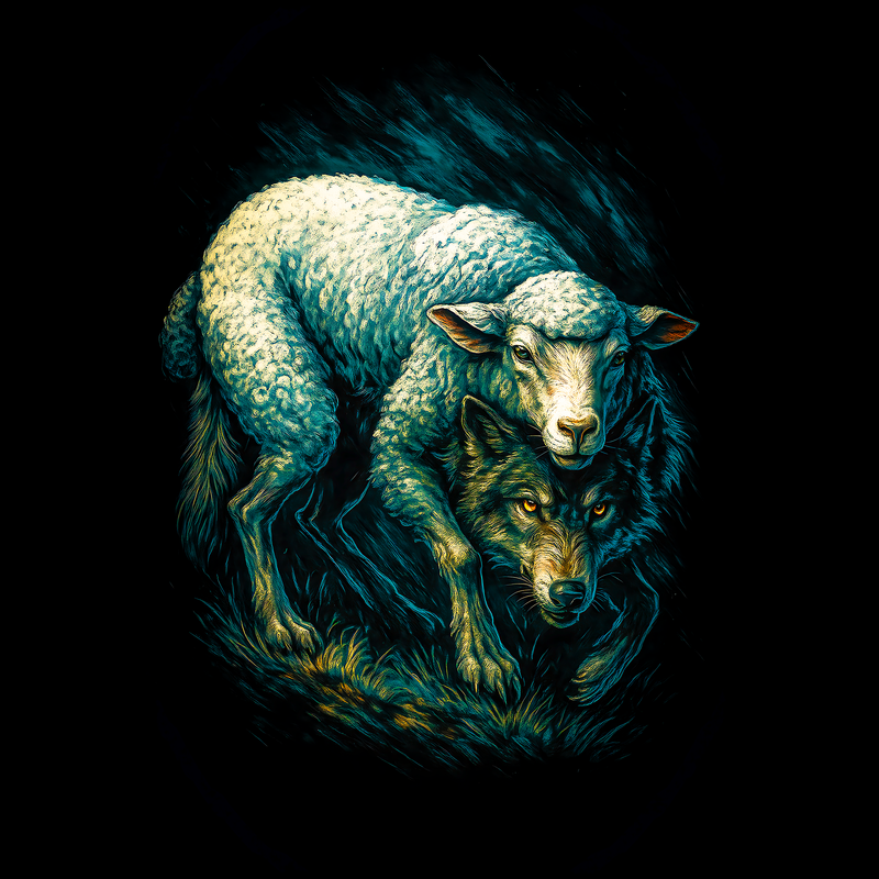 This striking image features a dramatic juxtaposition of a wolf and a sheep, rendered in a dark, stylized manner. The sheep, positioned atop the wolf, appears almost luminescent against the deep black background, its woolly texture detailed with teal and white highlights. Beneath it, the wolf lurks, its features sharp and menacing, with glowing orange eyes that pierce through the shadows. The overall aesthetic is reminiscent of a dark fantasy illustration, with bold, textured brushstrokes adding depth and intensity to the scene. The composition creates a powerful visual metaphor, suggesting themes of deception, hidden danger, and the contrast between appearance and reality.