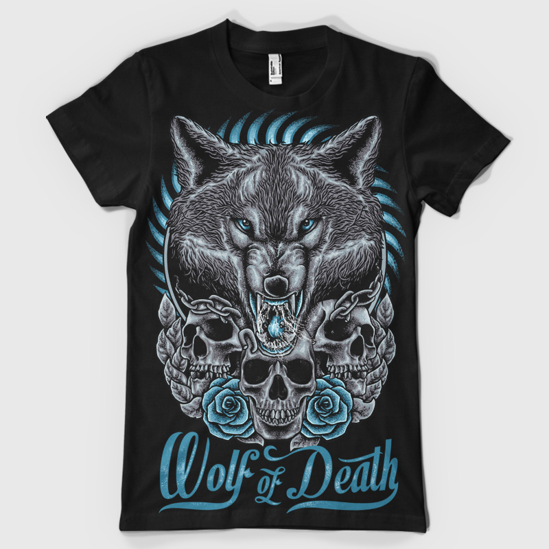 Wolf of Death t-shirt design. Digital illustration featuring detailed wolf, sorrounded by rose skulls and roses. The source file is available in psd format and can be accessed with the Photoshop software.