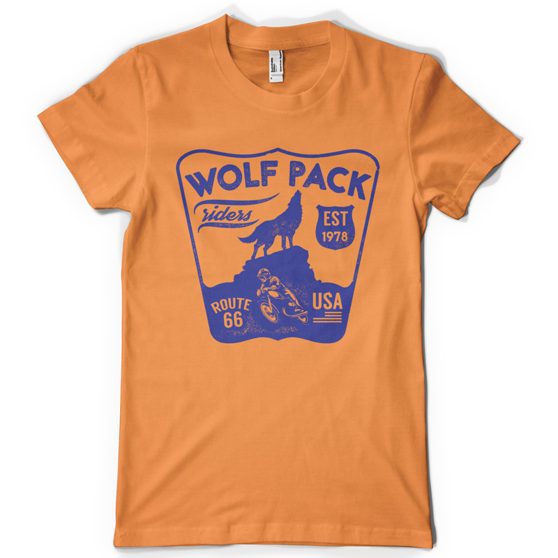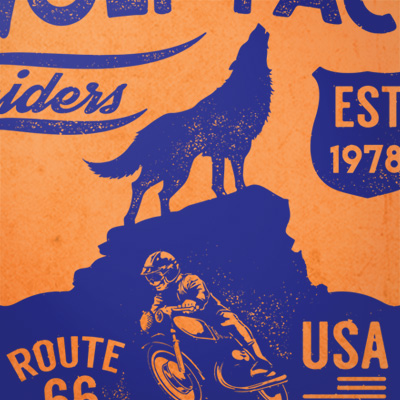 Wolf Pack Riders digital t-shirt design template in vector format, featuring detailed biker and silhouette of a wolf with racing elements, now available for Adobe Illustrator, Adobe Photoshop and Corel Draw. The file can be used for digital printing and screenprinting.