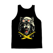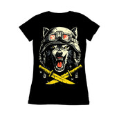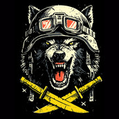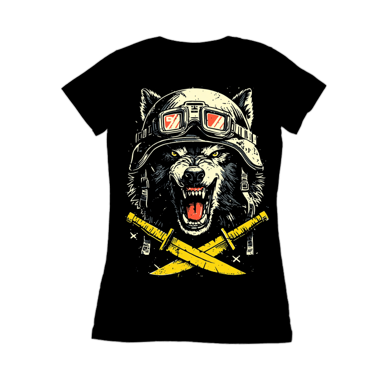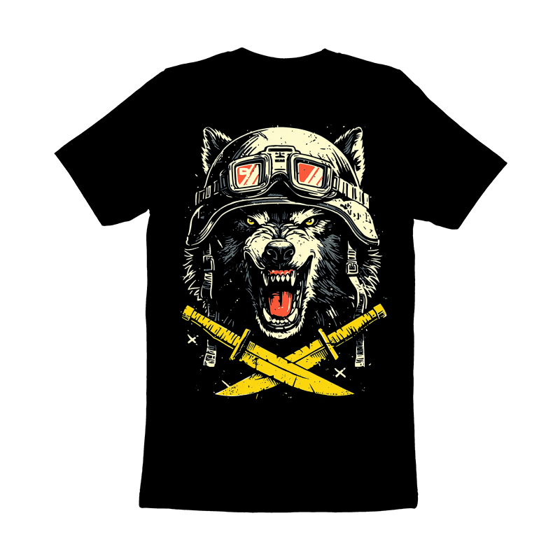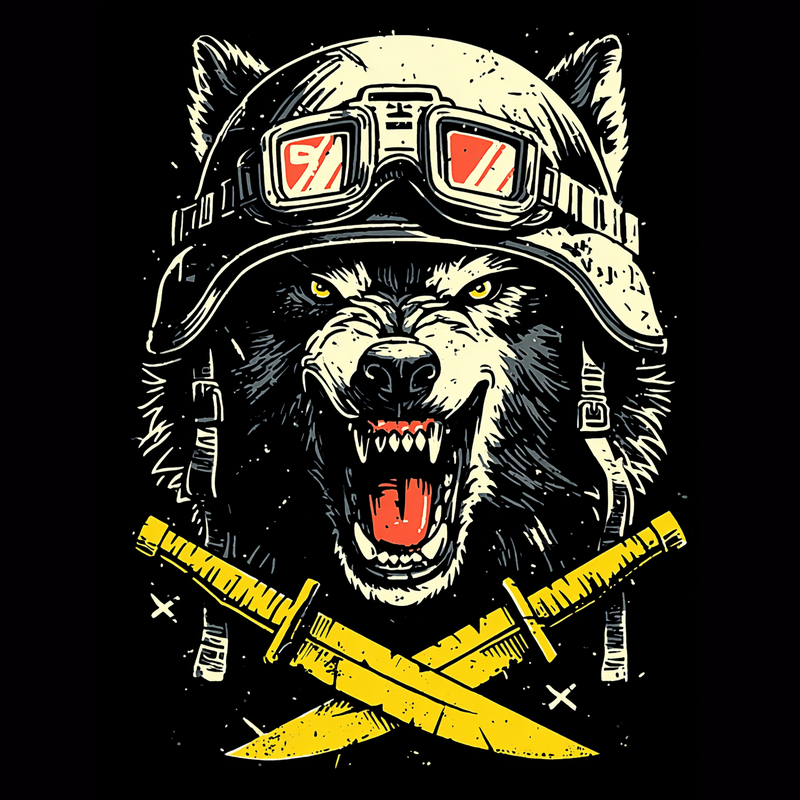This striking design features a snarling wolf wearing a vintage motorcycle helmet and goggles, exuding a sense of rebellious energy and untamed power. The wolf's intense gaze and bared teeth convey a primal ferocity, while the helmet and goggles add a touch of retro cool. Below the wolf's head are two crossed swords, adding to the design's edgy and aggressive feel. The artwork employs a bold, graphic style with strong lines and a limited color palette, enhancing its visual impact. The design is perfect for those seeking a bold and eye-catching image with a touch of vintage flair.