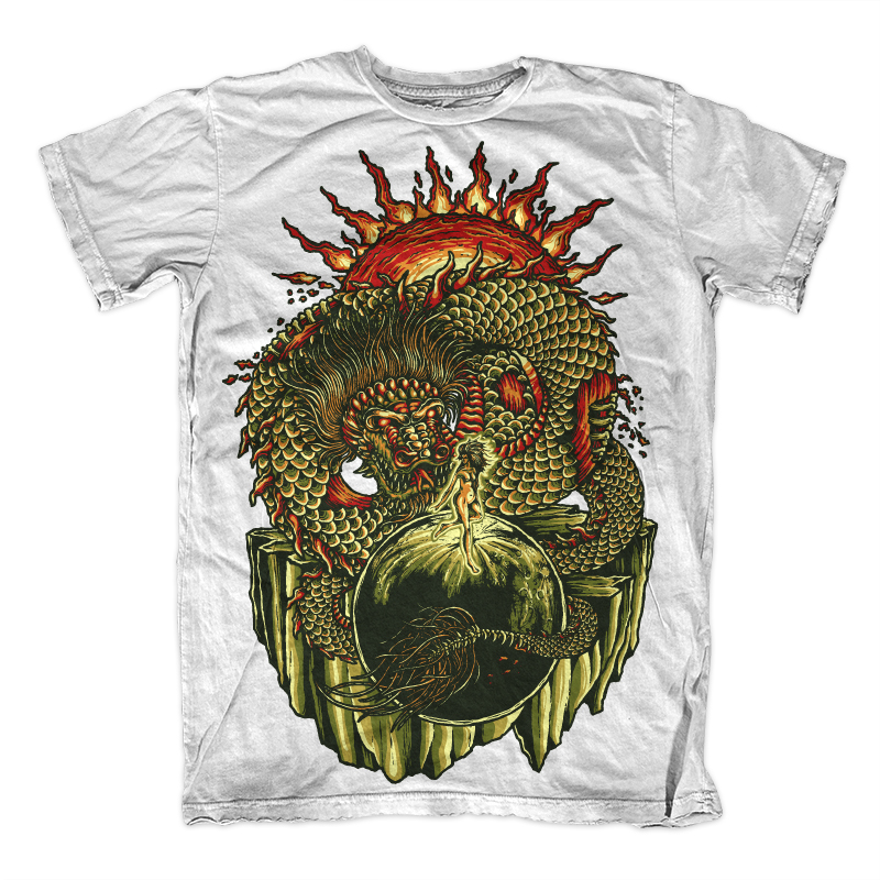 Illustration of woman and dragon with sun background and fantasy world. Ready to print on t-shirt.