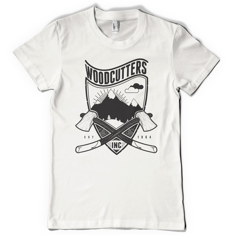Woodcutters graphic design template in vector format, featuring detailed woodchoppers and nature behind now available for Adobe Illustrator, Adobe Photoshop and Corel Draw and can be used for digital printing and screenprinting .