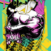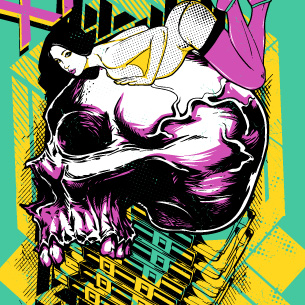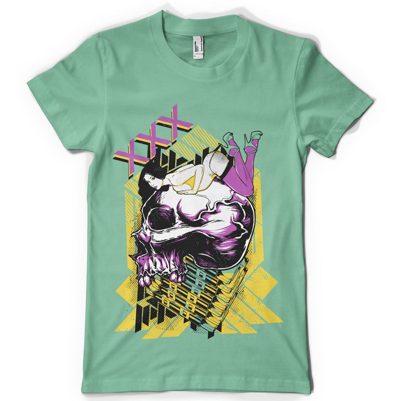 XXX graphic design template in vector format, featuring detailed glamourous girl on top of a skull now available for Adobe Illustrator, Adobe Photoshop and Corel Draw and can be used for digital printing and screenprinting .