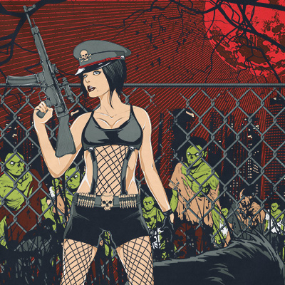 Zombie Hunter design features a sexy pin up lethal detailed screen print now available for Adobe Illustrator, and Corel Draw and can be used for digital printing and screenprinting