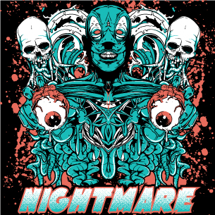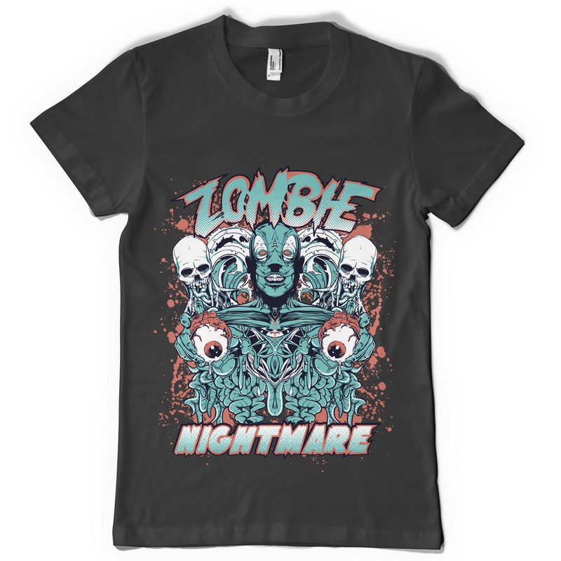 Zombie nightmare t-shirt design template in vector format, featuring detailed skulls and guts now available for Adobe Illustrator, Adobe Photoshop and Corel Draw and can be used for digital printing and screenprinting .